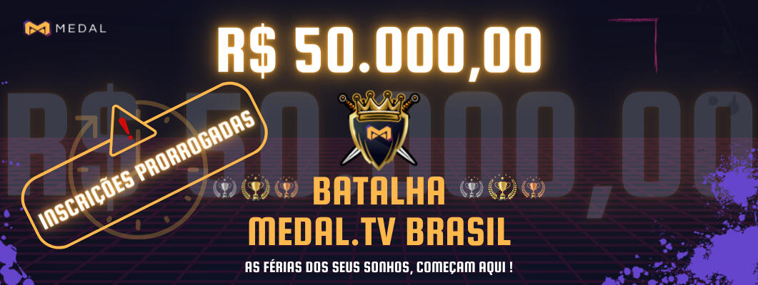A Batalha Medal.tv Brasil é um concurso oferecido pela Medal.tv no Brasil onde quatro influenciadores irão selecionar os melhores clipes de suas comunidades postados na plataforma Medal.tv. Cada influenciador terá sua própria hashtag e ao fim do concurso, o influenciador que tiver mais hashtags, poderá distribuir uma maior parte do prêmio para a sua comunidade (Veja mais detalhes abaixo)Mas as comunidades devem trabalhar juntas, pois para liberar 100% do prêmio de